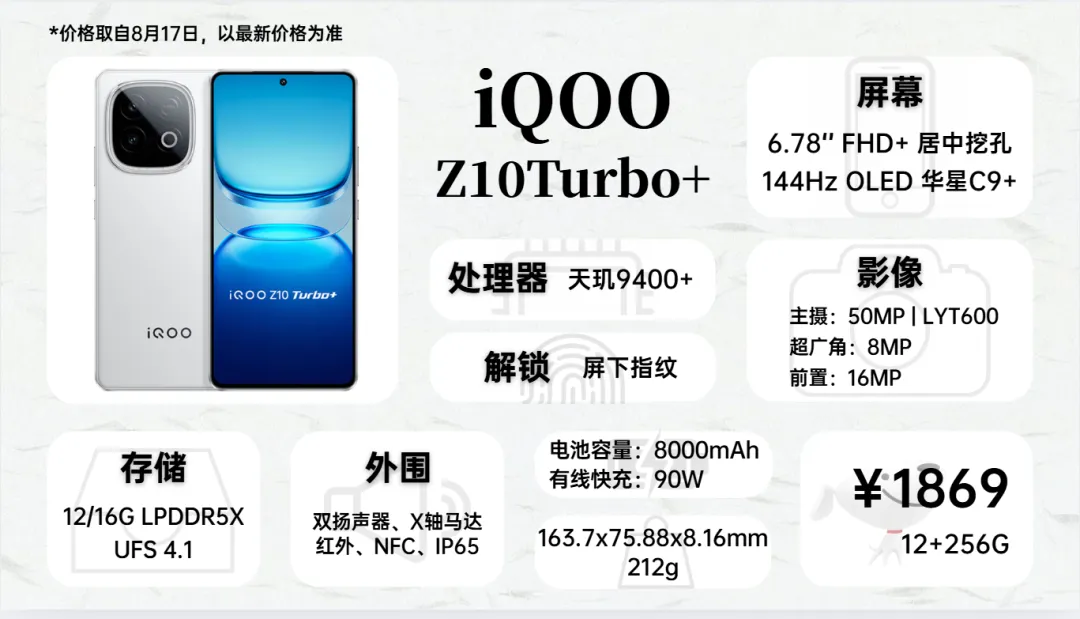 iQOO Z10Turbo+定位偏向于备用机和游戏手机,拥有8000mAh电池,天玑9400+处理器,毫无疑问非常适合打游戏和重度使用,不过它中框和后壳都是塑料材质,质感一般。