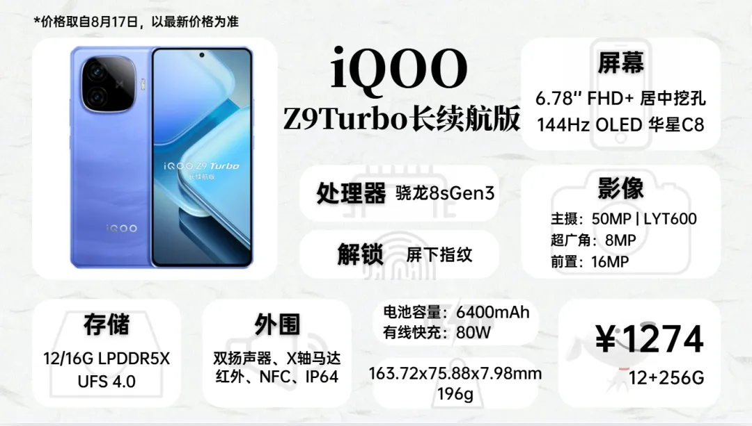 iQOO Z9Turbo长续航版和Z9一样,搭载华星C8材质直屏,屏幕素质不错,主摄升级到LYT600,在1200多的价位中性价比较高。