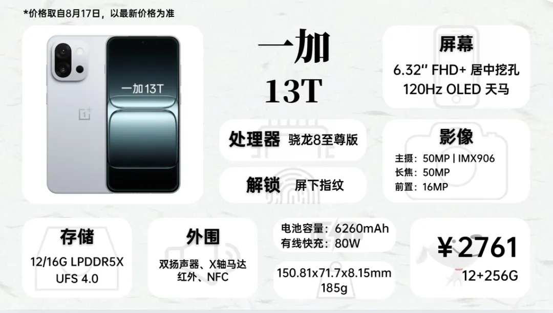 接下来推荐一款我自己很喜欢,但未必适合所有的人机型,一加13T,它是目前小屏旗舰中,电量最大的,小屏手机的续航不再是问题,不过它的阉割也非常明显,机身质感一般,主摄规格一般,直接砍掉了超广角镜头,还阉割了防水和超声波指纹。从定位来看,它还是低于像小米15、Find X8s这样的数字旗舰。