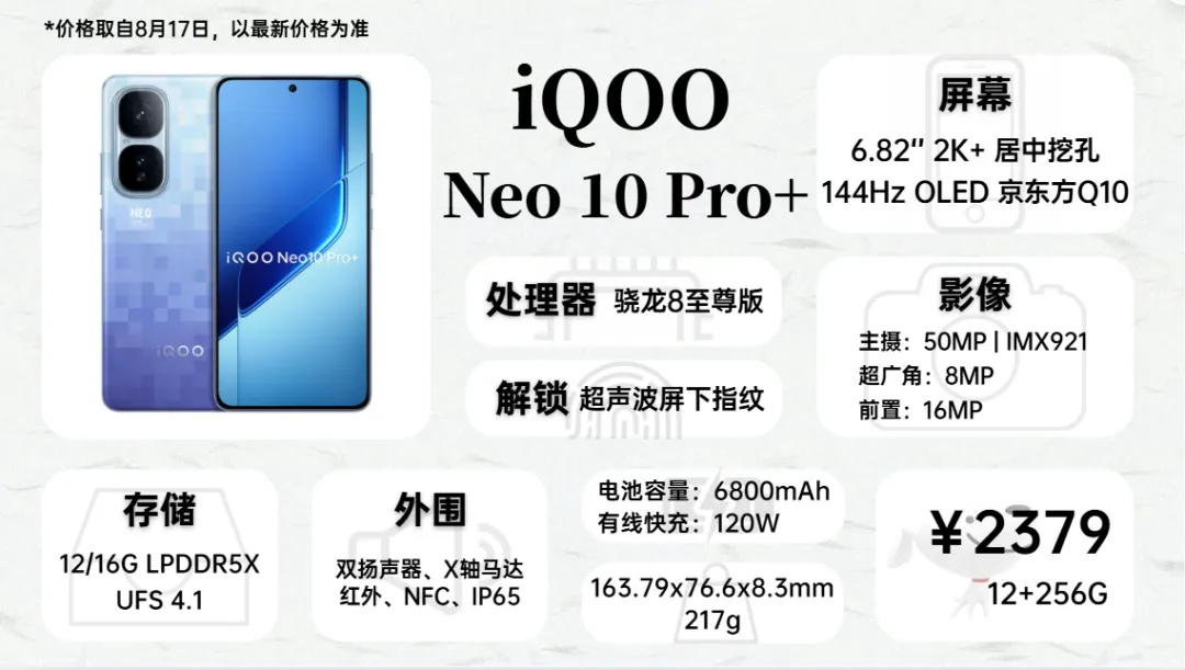 比起618的价格,iQOO Neo10Pro+本月没有涨价,更值得推荐了。对比GT7Pro竞速版,它屏幕升级到2K+分辨率,X200s同款主摄和下放的算法,拍照不错,还带超声波指纹,电池也大一些,但防水只有IP65,中框为塑料材质,质感稍逊一筹。