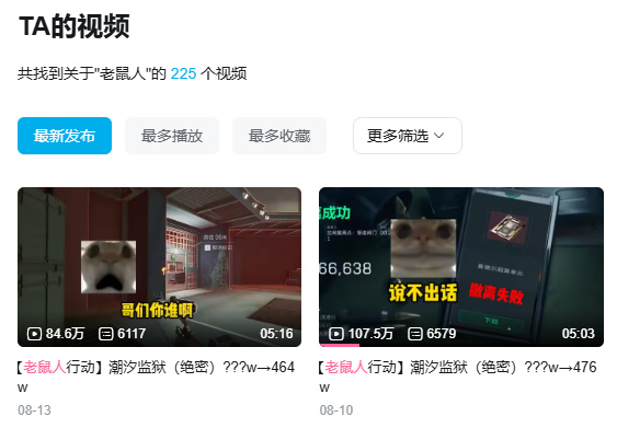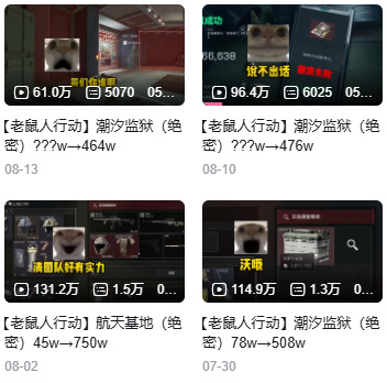 在这些国产搜打撤的社区中,开始出现一类视频,他们给游戏画面贴上一只表情唐唐的小猫,然后再配上当时正在起步阶段的勾石哈基米音乐,搭配快节奏的剪辑方式,成为了如今大火的老鼠人公式的雏形。