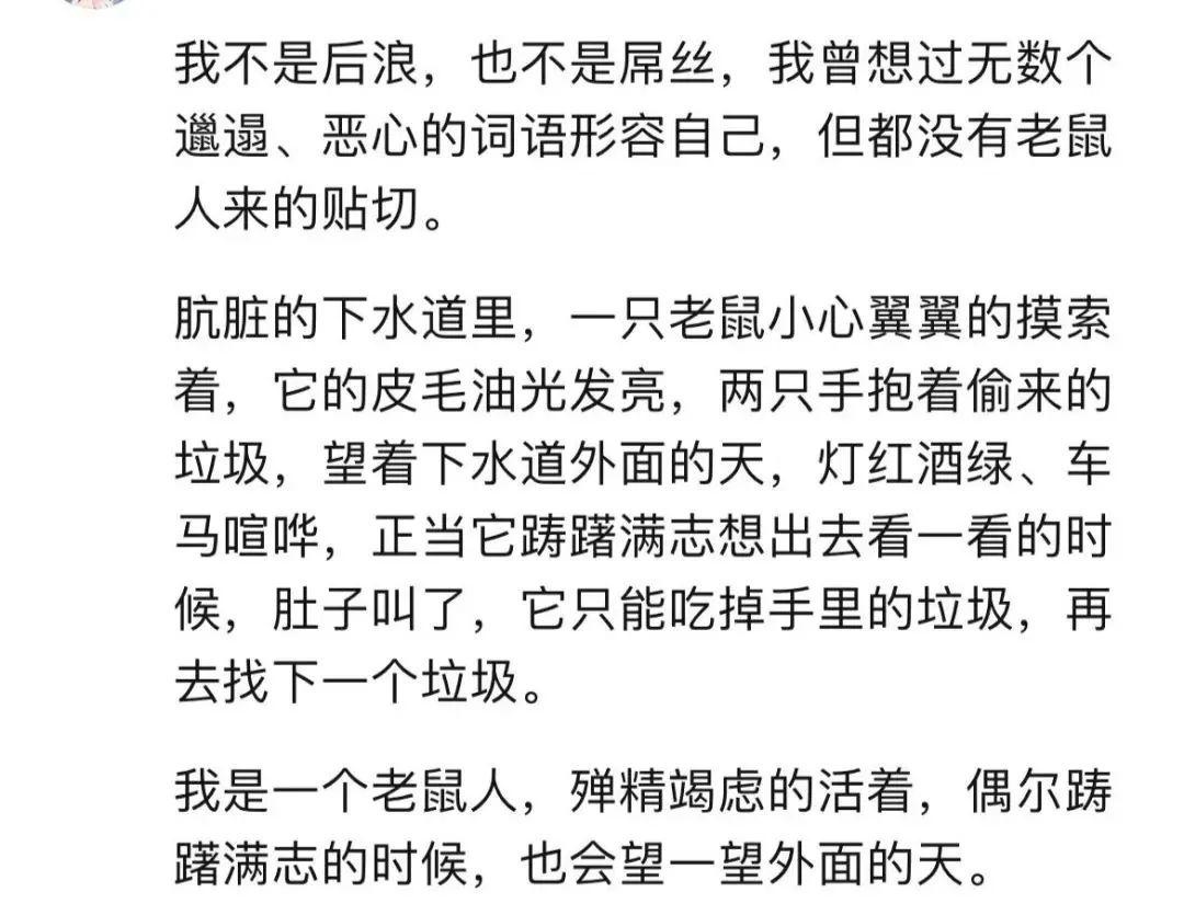 最初,互联网上的“鼠鼠我啊”,是从抽象中诞生的独属于年轻一代的自嘲,那段时间来自贴吧的鼠鼠文学风靡一时,年轻人们用着“鼠鼠我啊”起手的定型文,以淡漠的叙述语言,描述着自己得过且过的凄惨生活。
