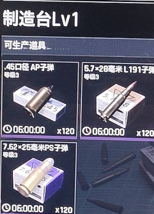 ①工作臺可以用來搓子彈和護甲,但是目前開放的子彈種類較少,有dvp88,7n9,ss190等,工作臺搓子彈的時間如下圖,6h一組,如果升到四級工作臺可以9h搓兩組。