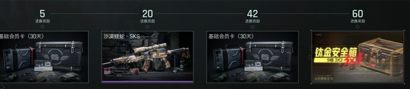 4.然後是賽季任務獎勵升級,最終獎勵將給出3*3的鈦金安全箱(進度5和42給的2*2基礎會員卡,20給的sks槍皮)。