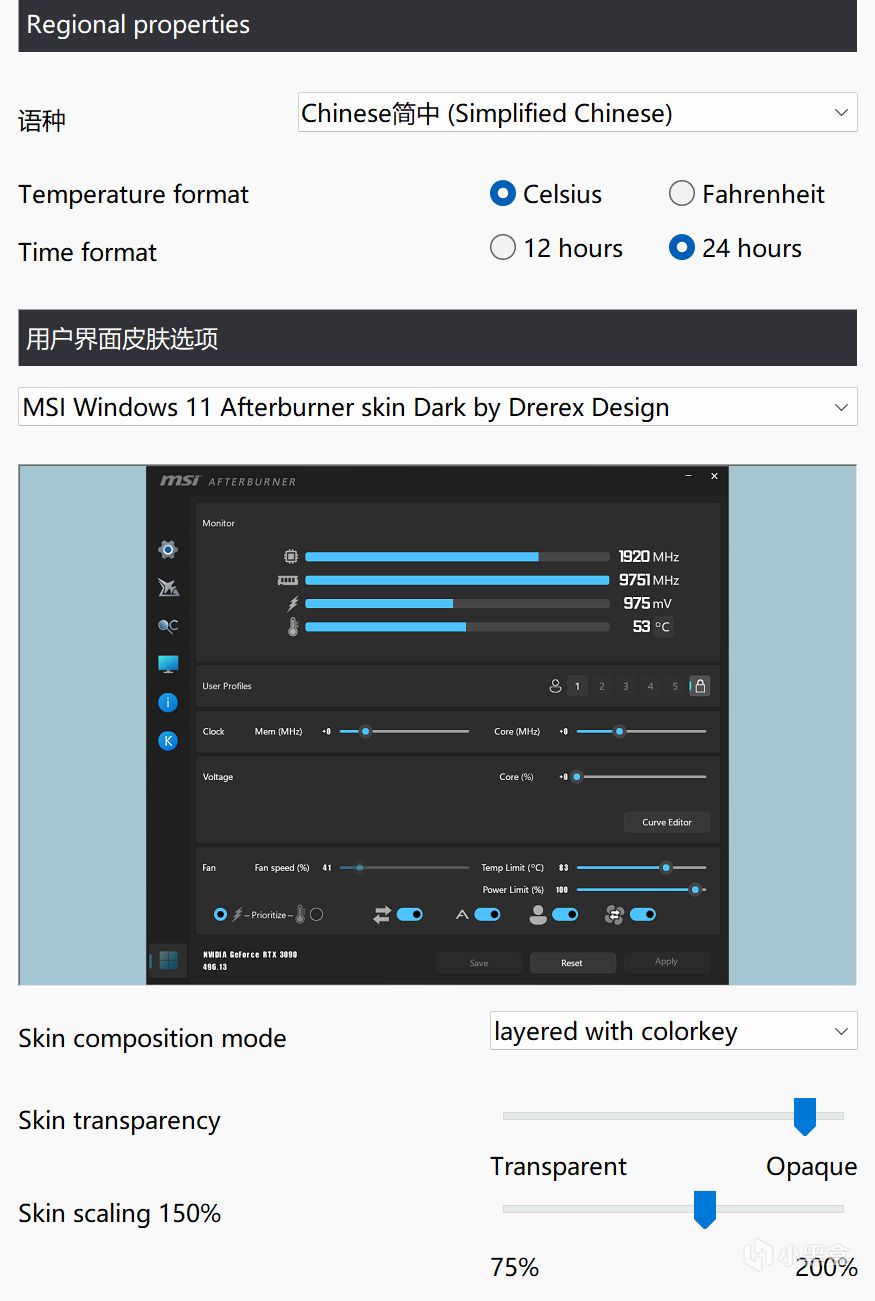 我不太喜欢这个界面,所以接下来的教程会使用MSI Win11 Afterburner skin Dark进行,在左侧齿轮中可以修改界面和语言