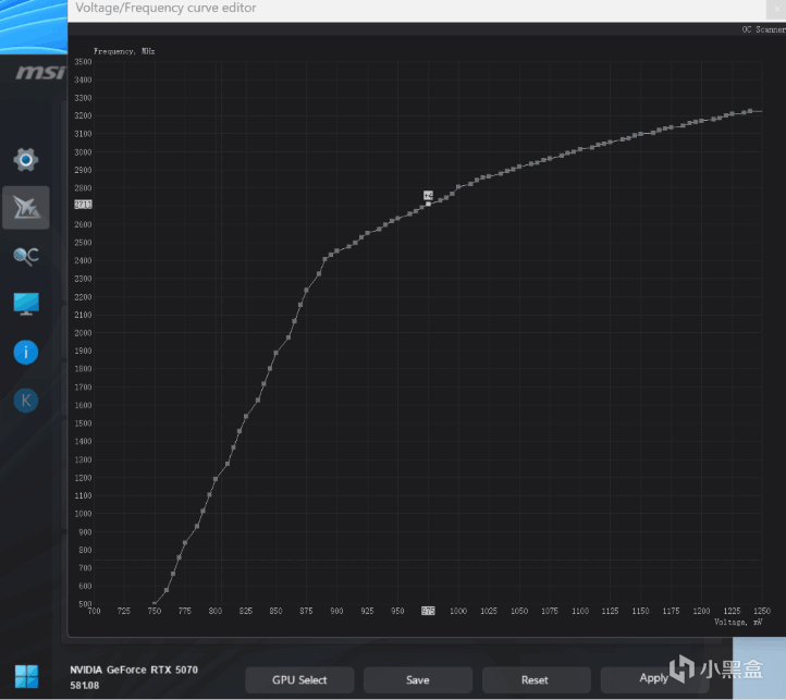 然后再说降压的操作,这个更简单了,回到Curve Editor中,这回是找到一个甜点电压,甜点电压并没有一个准确的数字,然后把这个电压对应的点左侧拉到原有的频率,右侧拉平,操作可以参考上一个GIF,像我的显卡是975mV,我就可以从950mV开始试,一次降10mV,到出现问题为止,我在950mV下跑了一次SpeedWay