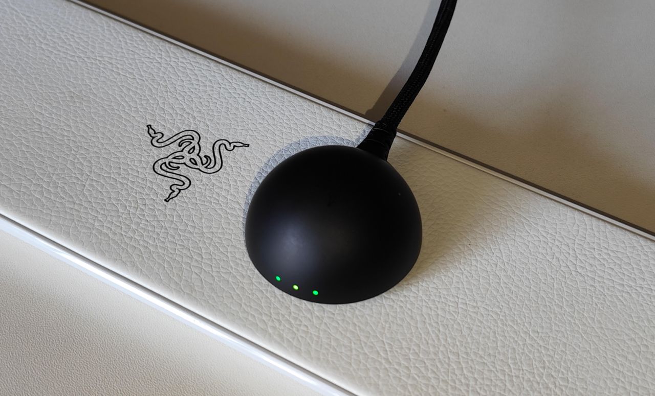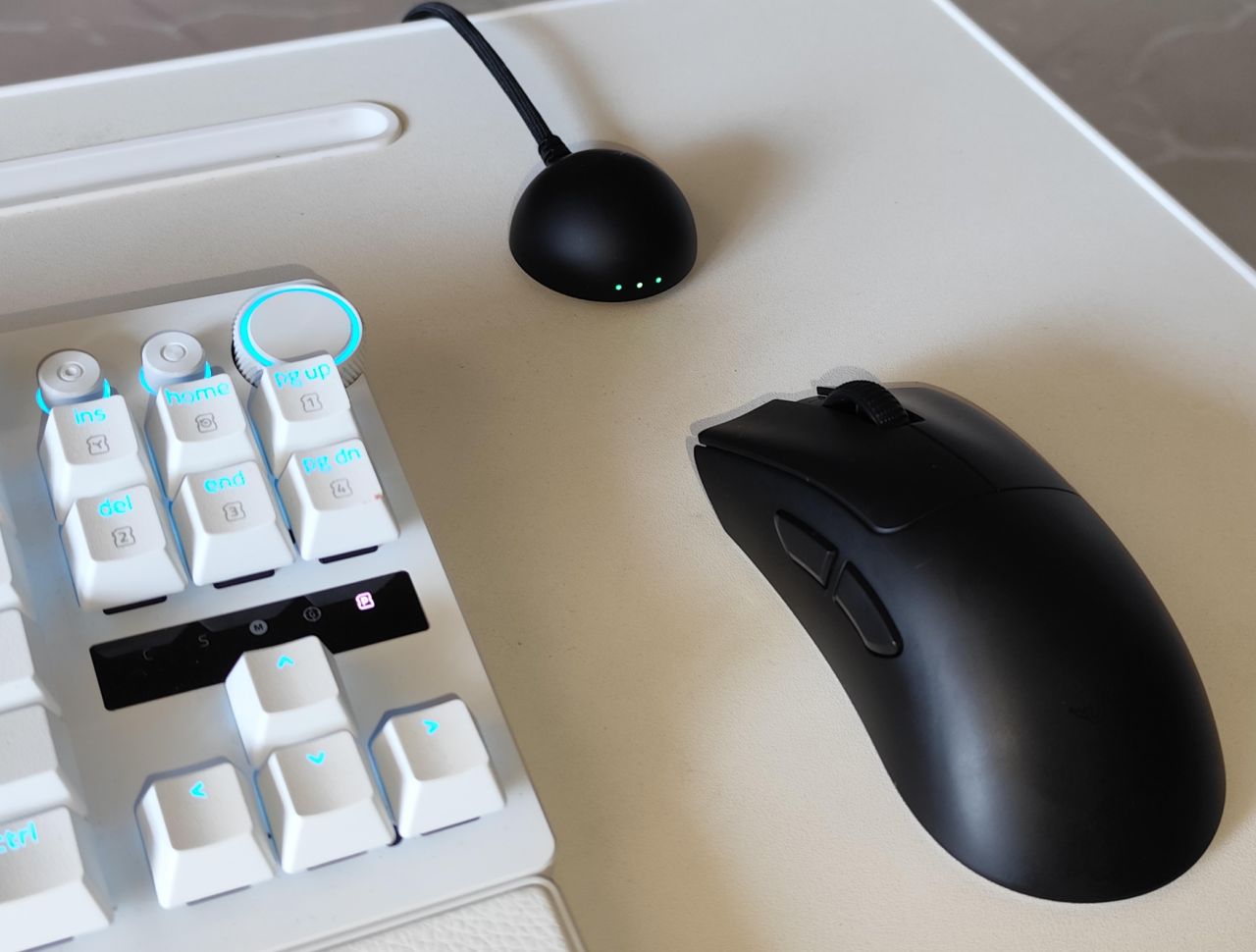 打开包装,最显眼的就在于这个2.4g接收器。这次接收器是半球形,通过一个2m长的type c编织线缆与电脑连接。别看它小小的,但内置配重(45g,和鼠标重量相近)+底部防滑贴,能够稳稳地放在桌面上。