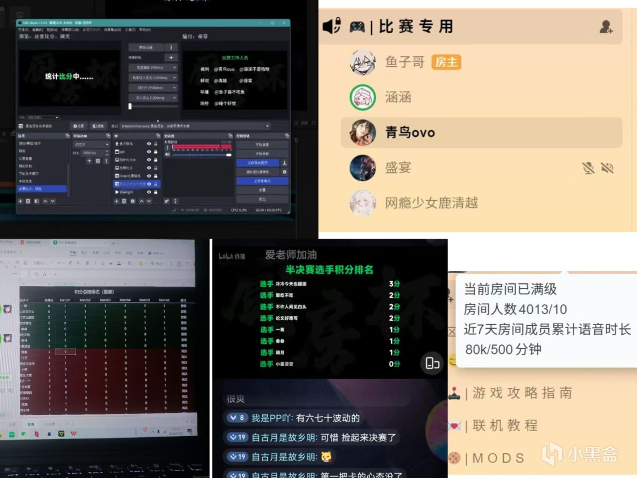 有趣的是,我们对办比赛一窍不通,一切方案都是摸索着过河。为此我甚至还学会了用OBS做导播,就这样稀里糊涂的开始了诸如比赛奖励,比赛规则,比赛形式,比赛赞助等多方位问题的讨论。同步又进行着招募选手的工作,在不同平台宣发比赛,吸引到了很多人来参加,虽然一切都匆匆忙忙的。但是我的朋友们从来没有说过放弃,在遇到瓶颈和情绪低谷的时候,是青鸟和涵涵支撑着我走了下去。前前后后的忙碌了十来天,最后比赛举办的很成功,也遇见了更多热爱胡闹厨房的朋友。回忆起来和伙伴们有欢声笑语,也有崩溃瞬间。虽然中间有许多插曲和突发情况,但是最终落幕的时候依然很感动。像青鸟说的一样:“和志同道合的朋友们做自己喜欢的事情真的很幸福。”那段时间每天都加班到很晚,每个人都在为爱发电。虽然累,但是真的很快乐。