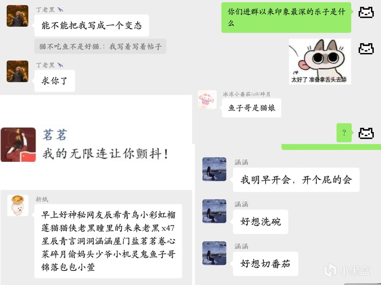 群里开始有了说不完的话题,也加入了越来越多的小伙伴,比如沉默寡言但是很厉害的竹子、要求把自己写成变态的丁老黑、本体是西红柿但自恋的太子、腹黑的少爷、复读的Ap、常驻太医洞洞、玩小游戏很厉害的折纸、喜欢搞怪的小熊、使用无限连让你颤抖的茗茗…………还有很多有趣的小伙伴,每天打开群聊都能笑上半天。