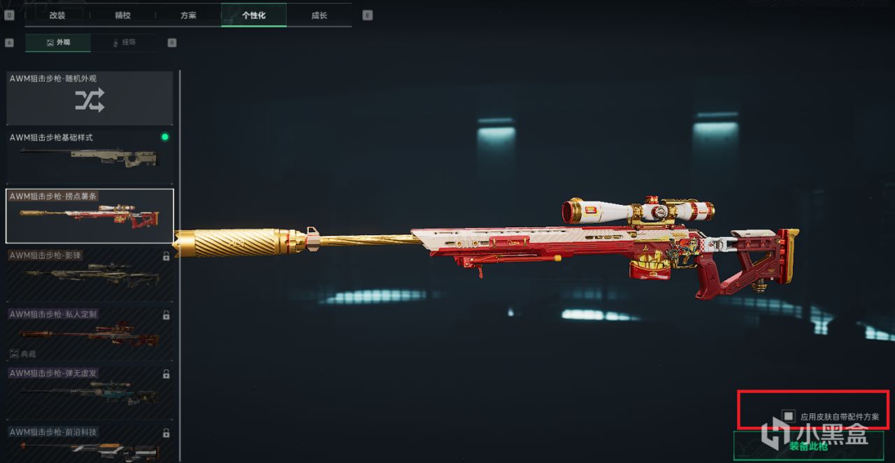 在大战场改枪界面只换皮肤是改不出来这个配件的,但是只要你勾选了应用皮肤自带配件方案这个选项,再装备捞点薯条皮肤,你就会发现AWM上多了一个快拔套,这个时候就能随便切换配件了,而且不管怎么切配件这个快拔套都在。