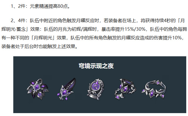 首选-穹境示现之夜4件套(新圣遗物)-毕业套装:提升元素精通和月曜反应伤害。