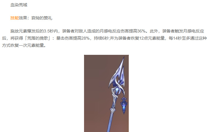 首选专武-血染荒城:菲林斯专属武器,特效提升月感电反应伤害和暴击伤害,并且回复元素能量,保证自身能量循环。