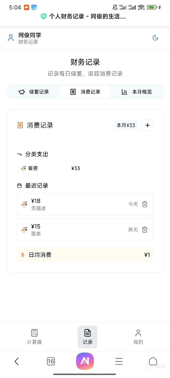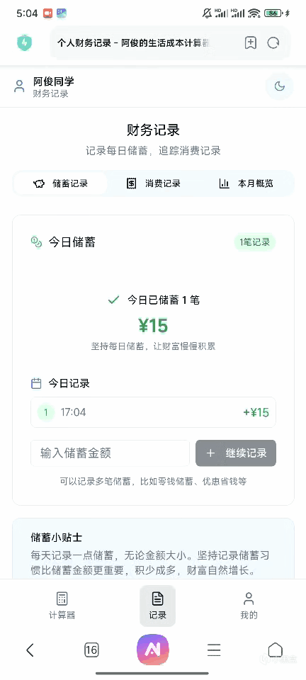 2.记录页面(原谅我GIF压缩画质)可以记录你自己每日入账了多少