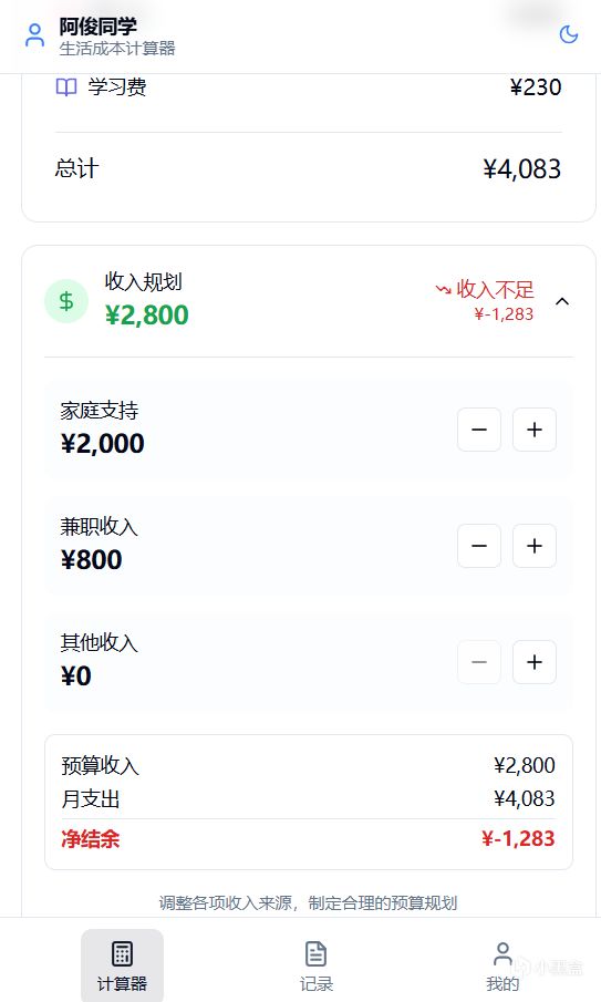 在这个经济下行的时代,我发现市面上没有一免费的款生活成本计算器,阿俊直接做一个免费的不就好了?希望能帮助到毕业或者还没毕业的大学生们