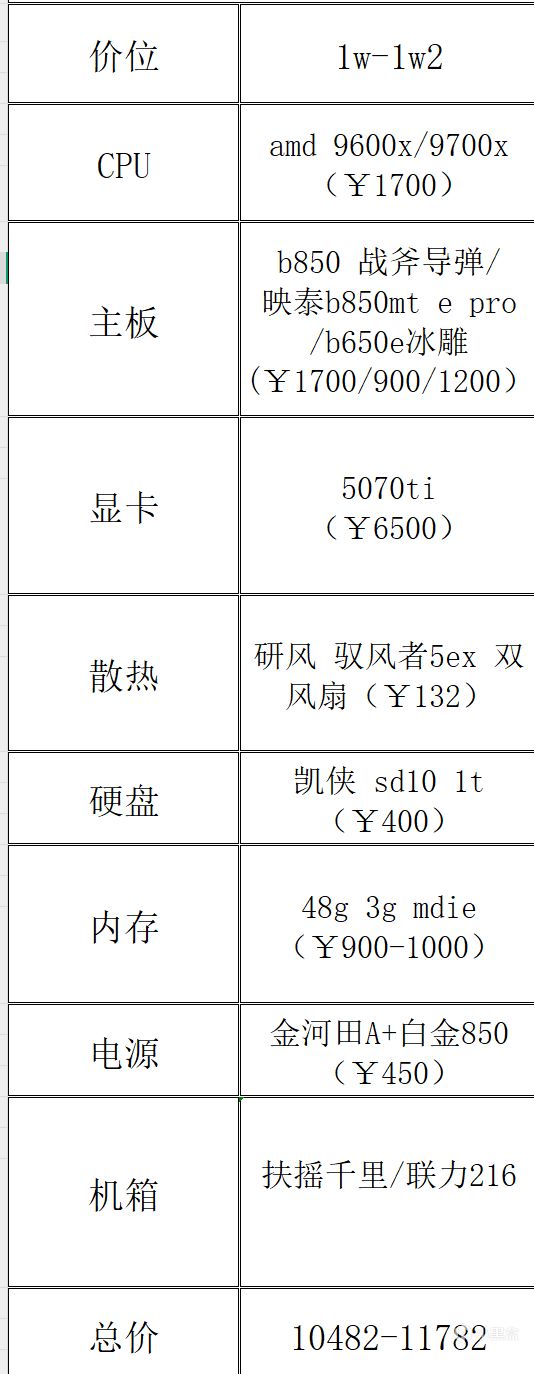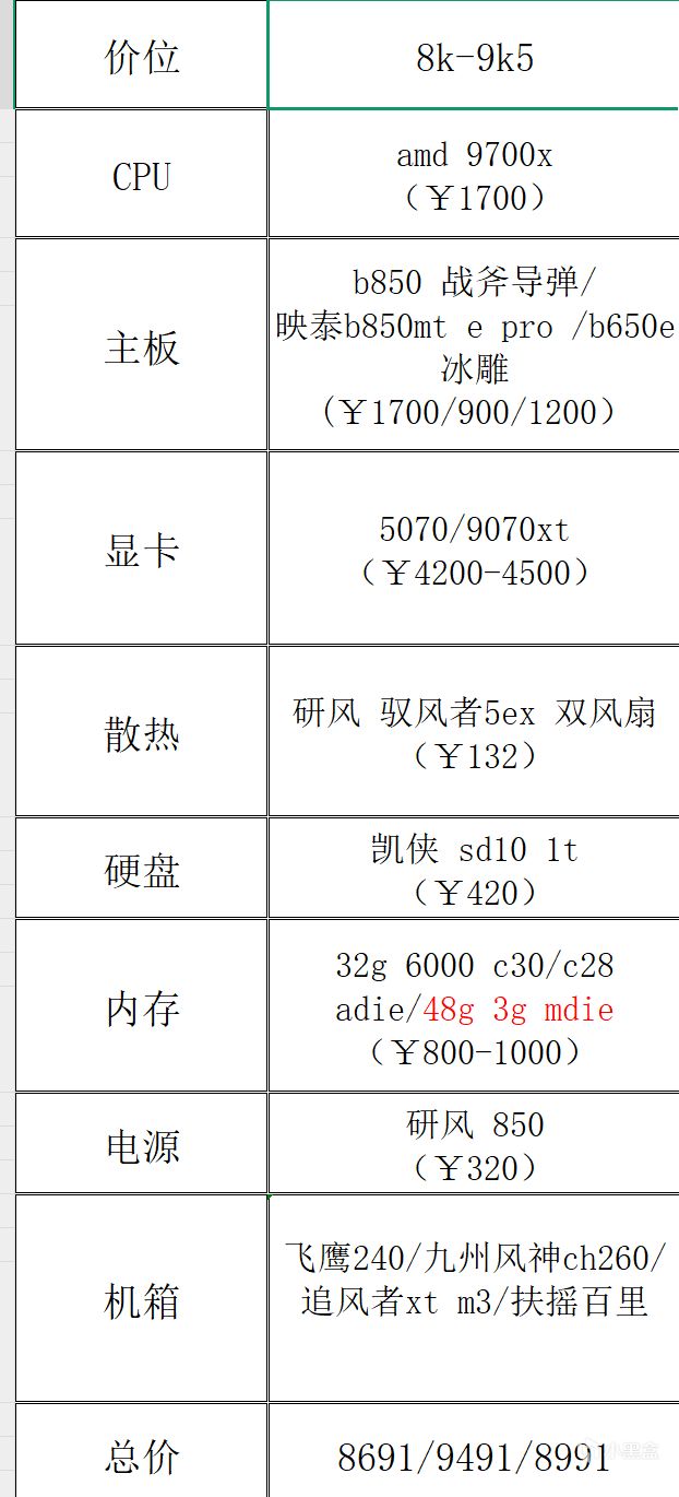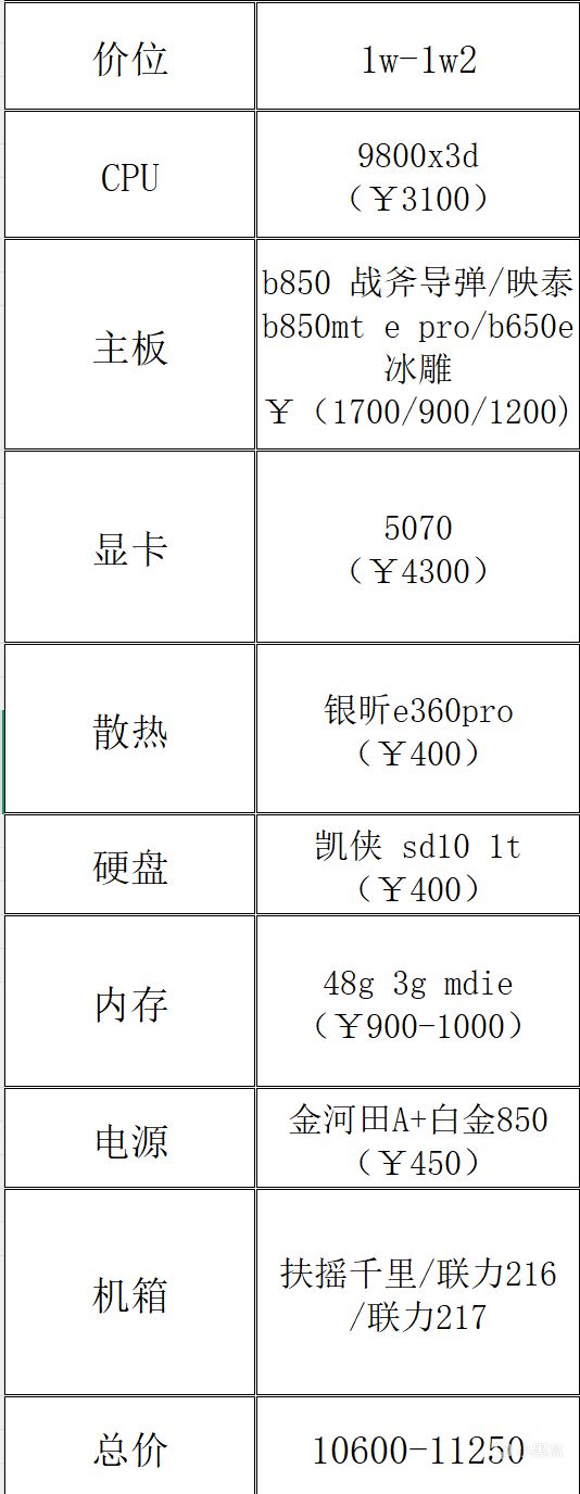 可以看出這個價位的選擇就很多了,不過我更推薦內存選擇24*2 海力士3gmdie的內存條,在價格相差不多的情況下,如果你不玩3a,就玩一些網遊,可以換成5060ti+9800x3d的組合。