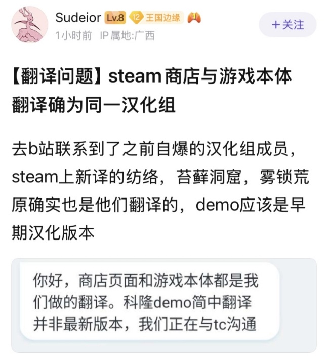 有玩傢俬信/詢問到疑似參與本作中文本地化的人員,該人士表示 科隆展上用的是試玩版內置的簡體中文,但並非最新/最終版本,翻譯組正在與開發方(Team Cherry)溝通並推動後續修正。媒體在報道里也引用了類似說法。也就是說:目前流傳的“奇怪翻譯”可能是來自於一個早期/測試性的字符串包,而非最終上線翻譯。