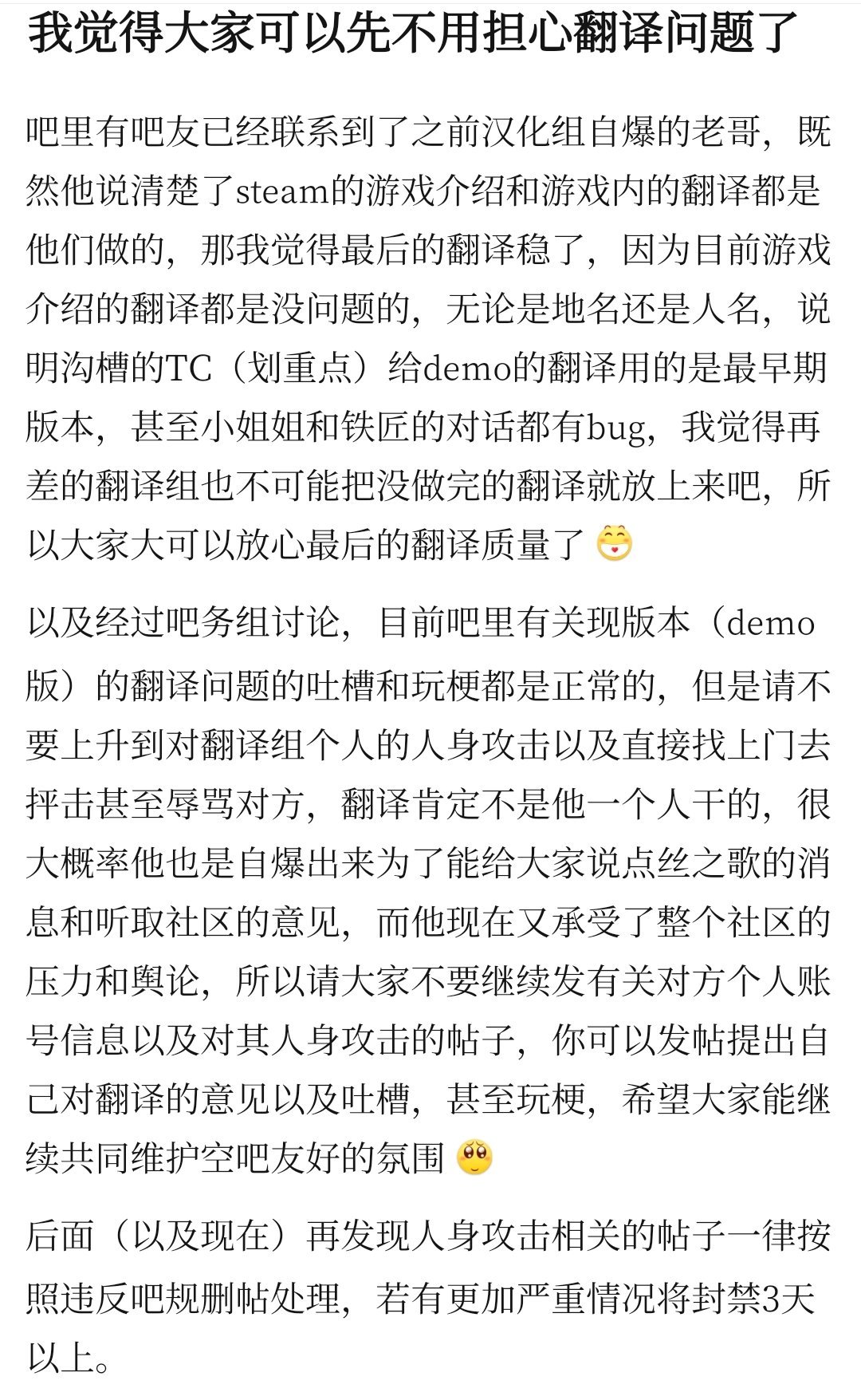 B 站 UP 主 “史黛拉啦啦啦” 在科隆試玩版的視頻裏展示了試玩畫面和中文界面文本。不少玩家在貼吧看到這些視頻後,開始討論並指出試玩版的簡體中文字符串存在用詞怪異或不夠自然的問題。
