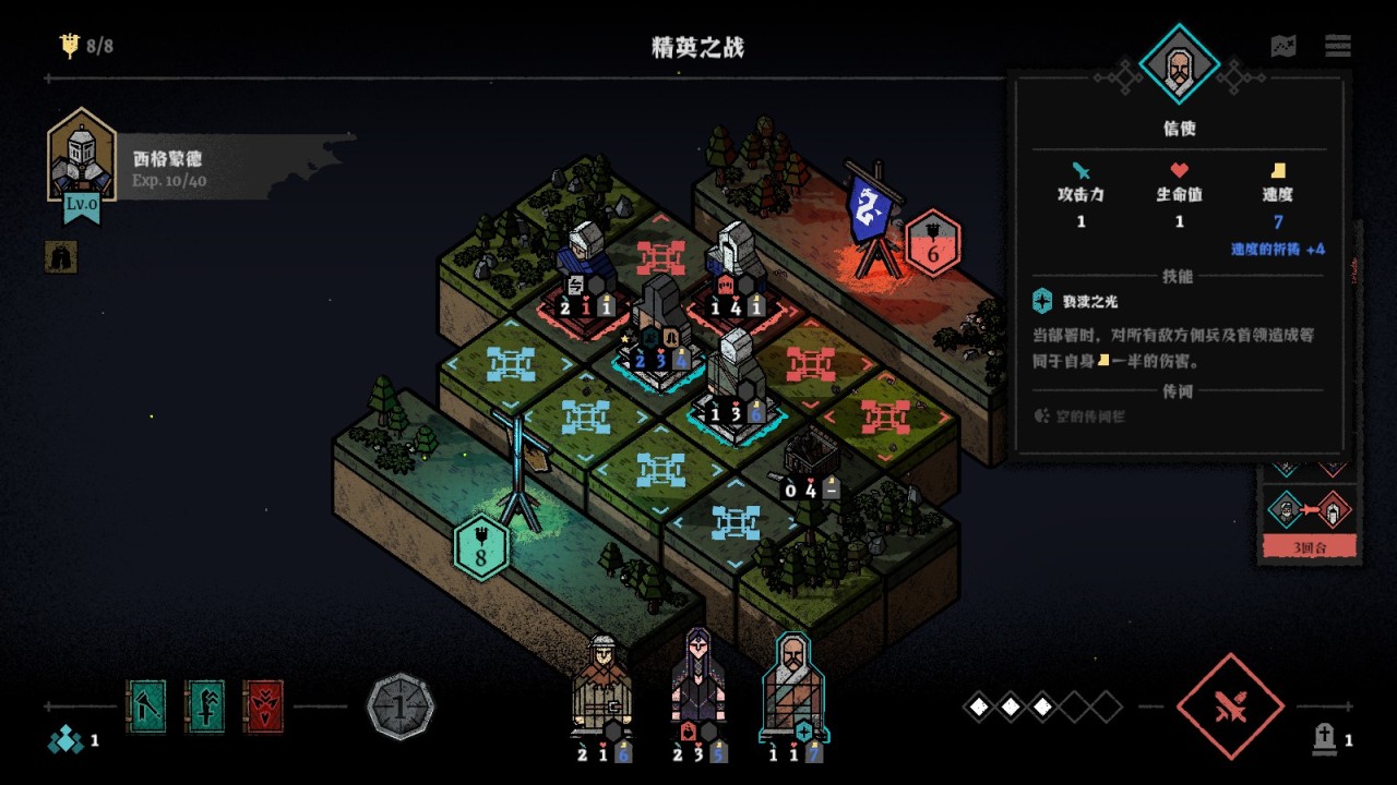 而傭兵的選擇,則是另外一個重要的策略點。傭兵有三個數值——攻擊、血量、速度。我們在派出傭兵作戰的時候,最基本的操作就是如果棋盤上的某一列已經有敵方傭兵,那麼我們就儘量不要派一個速度低於對面的傭兵,否則會導致兩者接觸後是對面先手攻擊,如果對面的攻擊力大於我方傭兵的血量,那我方就直接白給了。至少也是派一個速度和對面持平的,這樣雙方ROLL點比大小,運氣好的話我們還是能先手的。