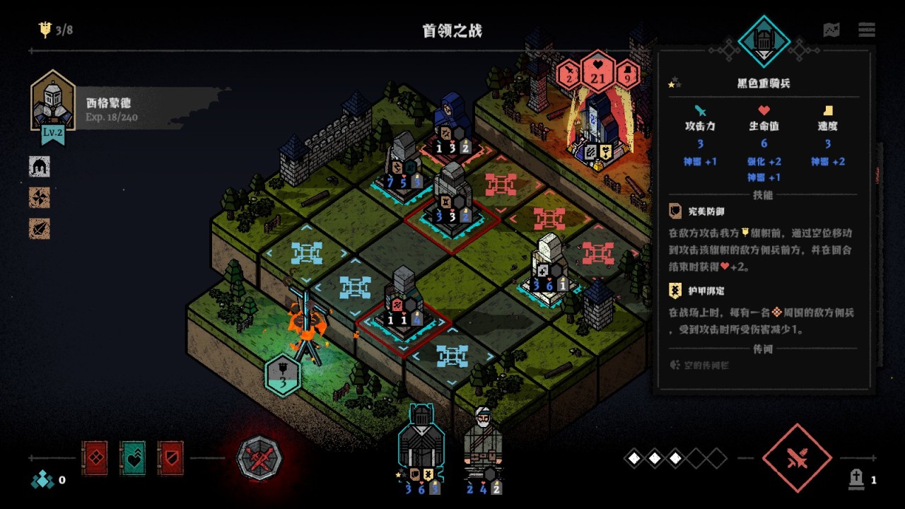 比如在第一個場景的關末,有時候會隨機到一個發射“藍色火球”的BOSS,這個BOSS的技能是每回合開始後對棋盤上的隨機格子造成傷害,即將被他射中的格子會以紅色邊框在回合開始之前醒目地顯示出來。此時,我們消耗1費將站在紅色格子裏的傭兵移動到其他格子,就是非常具有性價比的一個操作了。