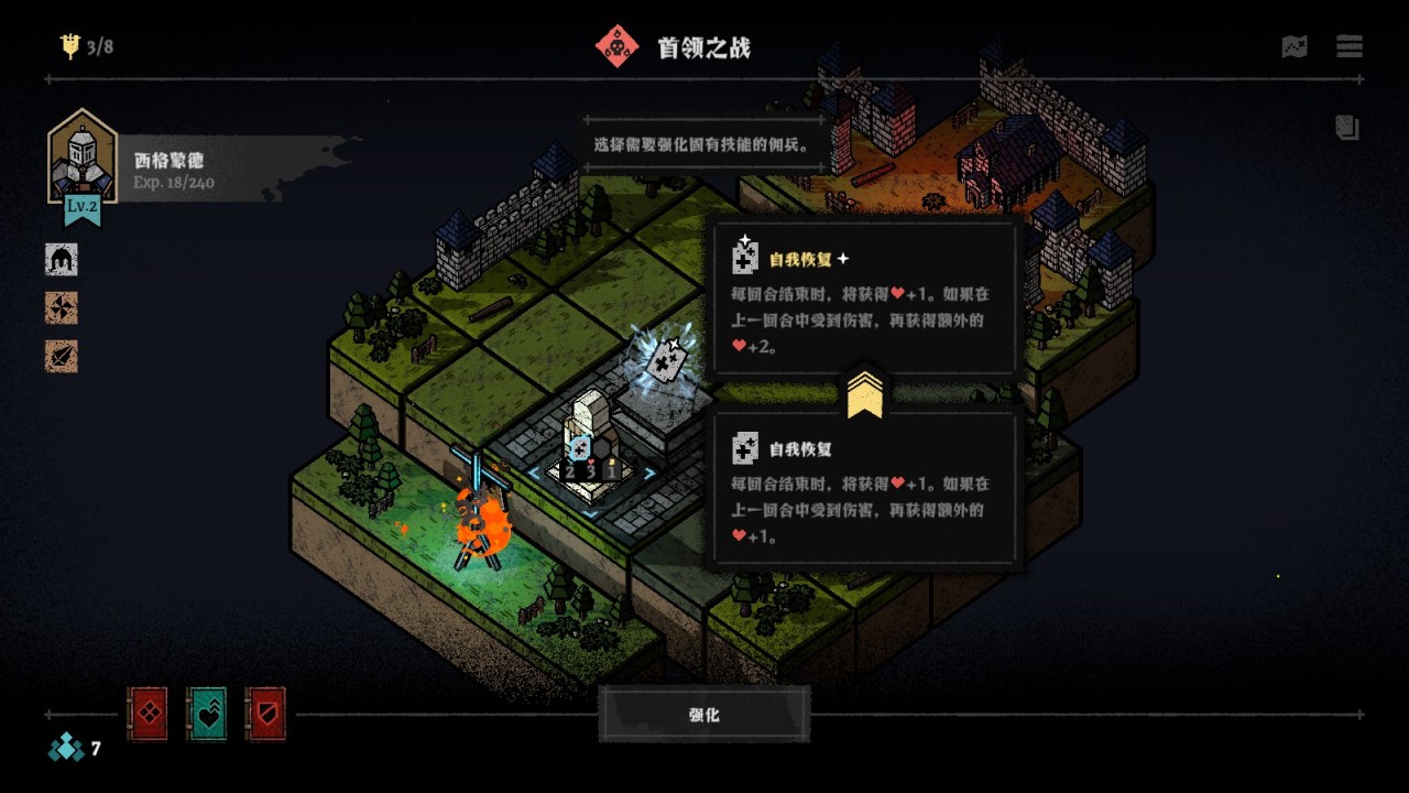 之前我還嘗試過一些其他的思路,比如每回合恢復血量+受傷後給自己加攻擊的技能搭配,這樣就能形成一個“越受傷越強大”的效果,同樣可以“養”出大哥,並且這種技能組合是有成長性的,可以讓傭兵在戰鬥中持續性地膨脹自己的數值。