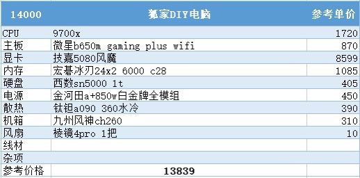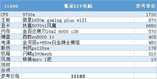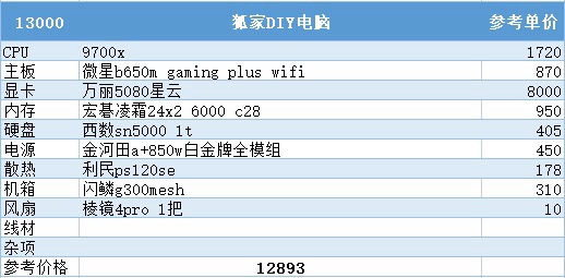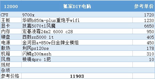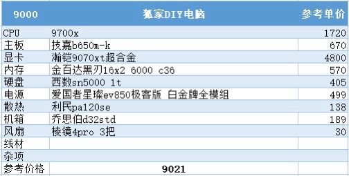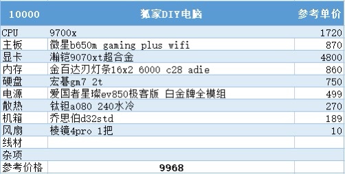 到了9000元预算就可以上到9700x加9070xt了,9700x可以说是万金油,不管网游还是单机都可以无脑上,9070xt超合金作为瀚铠的旗舰现在跌到4800这个价位也可以说是无敌性价比了,畅玩4k的性能无需多言