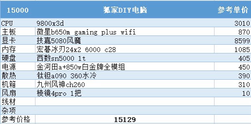 到了这个预算终于可以上到终极的9800x3d加5080的组合了,普通游戏玩家的终点了