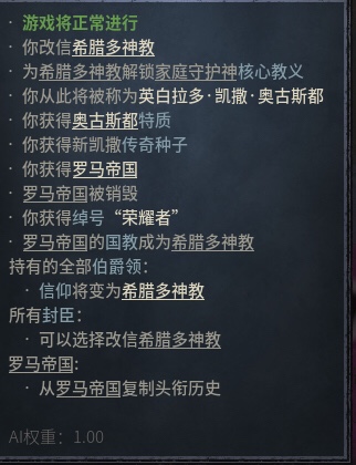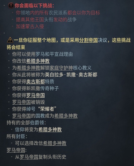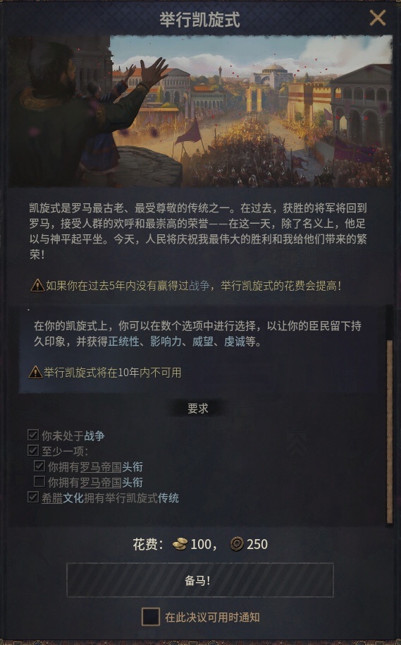 游戏中凯旋式间隔十年可举办一次,可以选择前往竞技场还是大教堂,并通过各种分支选项获得不同加成。