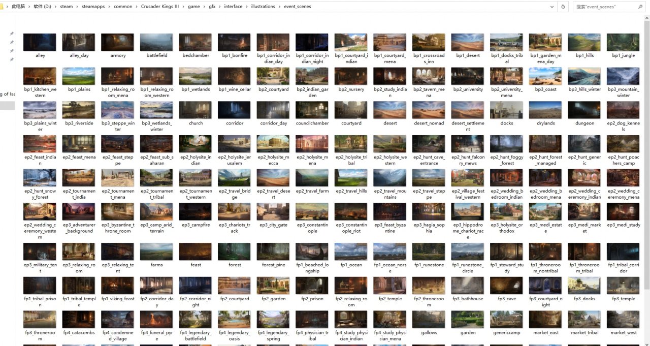 第一种,到Crusader Kings III\game\gfx\interface\illustrations\的文件夹里去翻,随便点开一个,可谓眼花缭乱