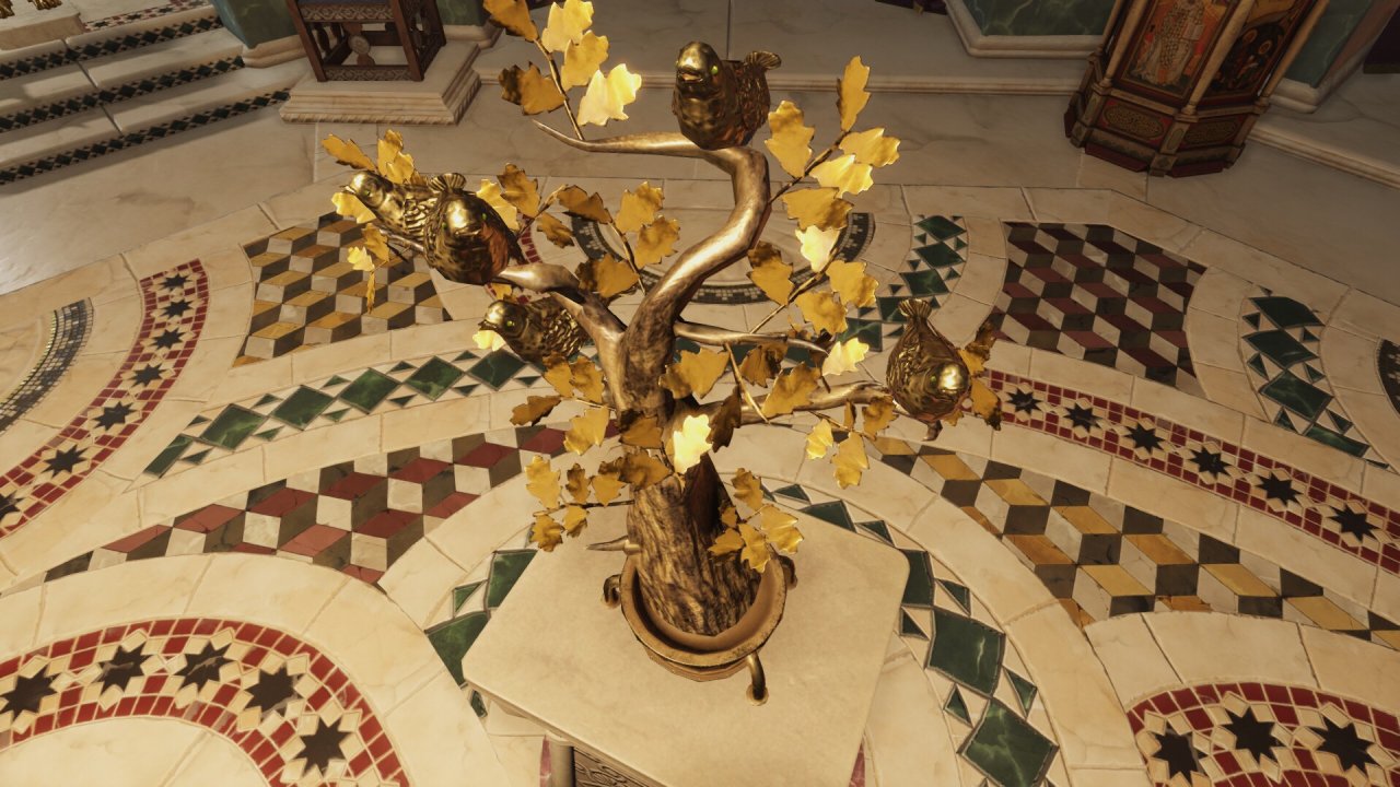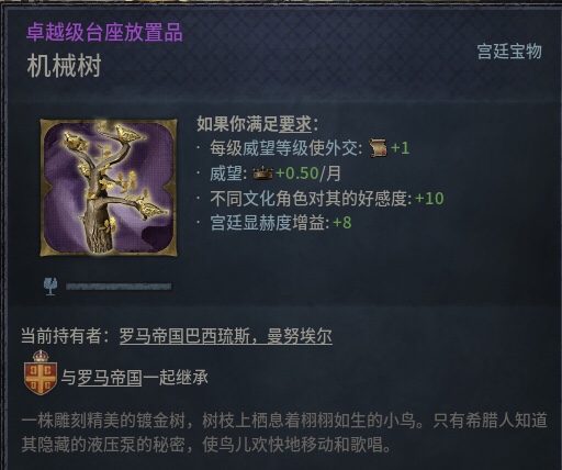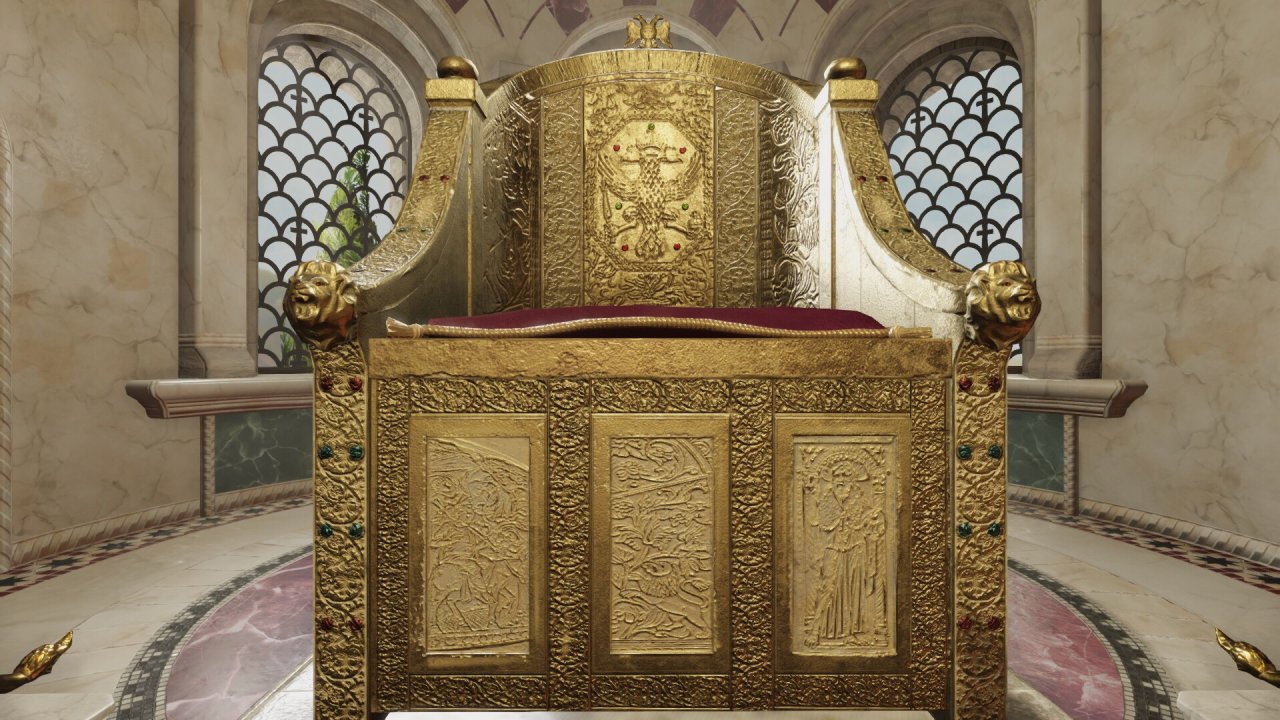 接下来是金銮殿,游戏中,只要定都君士坦丁堡,可以使用美轮美奂的东罗特色王座大厅,能发出吼声的金狮、金树上鸣叫的金鸟、能从地面上升起的王座、以水做动力的风琴,都被p社做出来了。