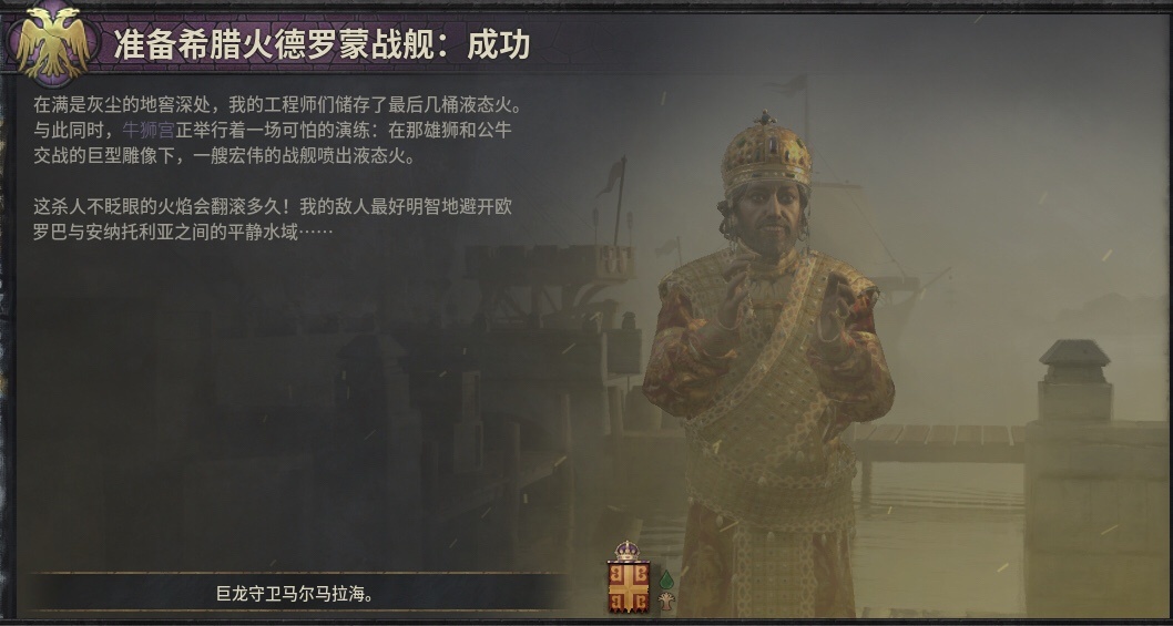 游戏里研发可以库库烧人的希腊火德罗蒙战舰,就是在牛狮宫进行的,不过可惜配图是通用的港口。