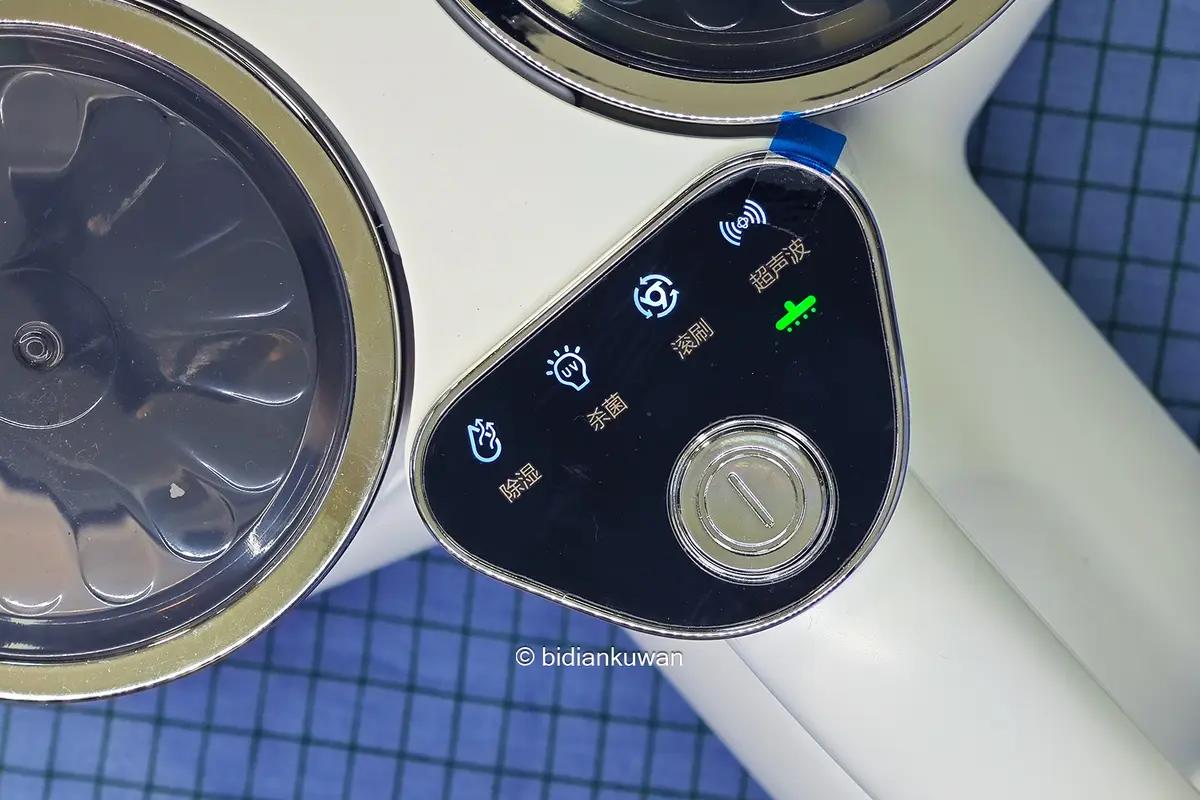 一键操控+显示屏特写。可以看到4大功能灯以及左右各一个“尘螨感应”灯(对应灰尘传感器),可以直观体现机器工作状态和被褥面脏污程度。