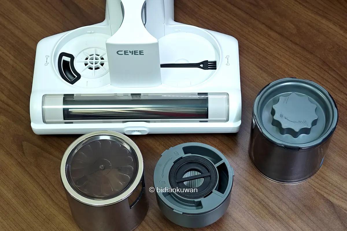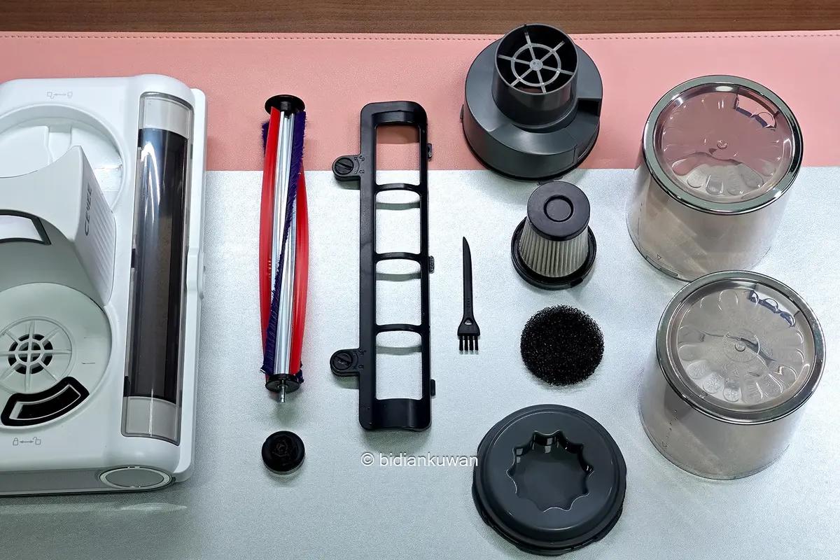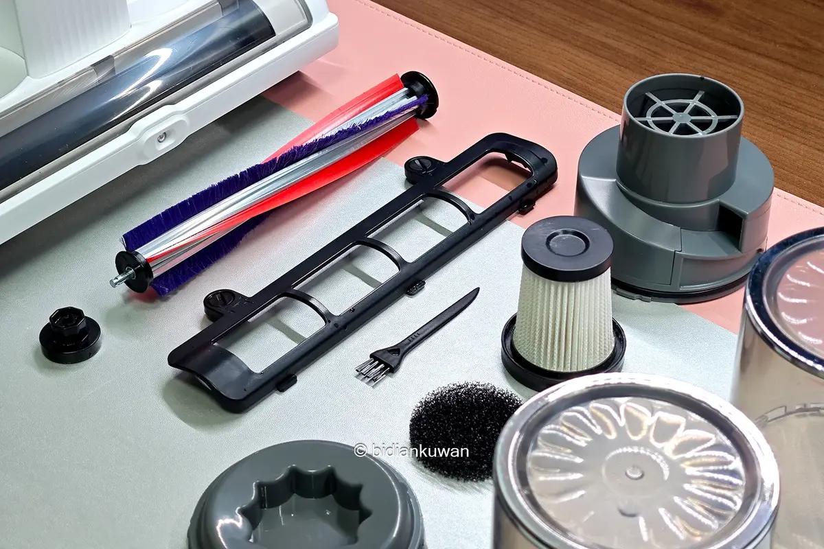 下图是我将其可拆卸零件全部“分解”后的“全家福”,可以看到不止两套尘杯、滤芯可以轻松拆解,辊轴结构也可拆下,每次打扫之后可以无死角清洗,机器内部不会积攒脏污细菌,下次投入战斗时仍是“干净帮手”。