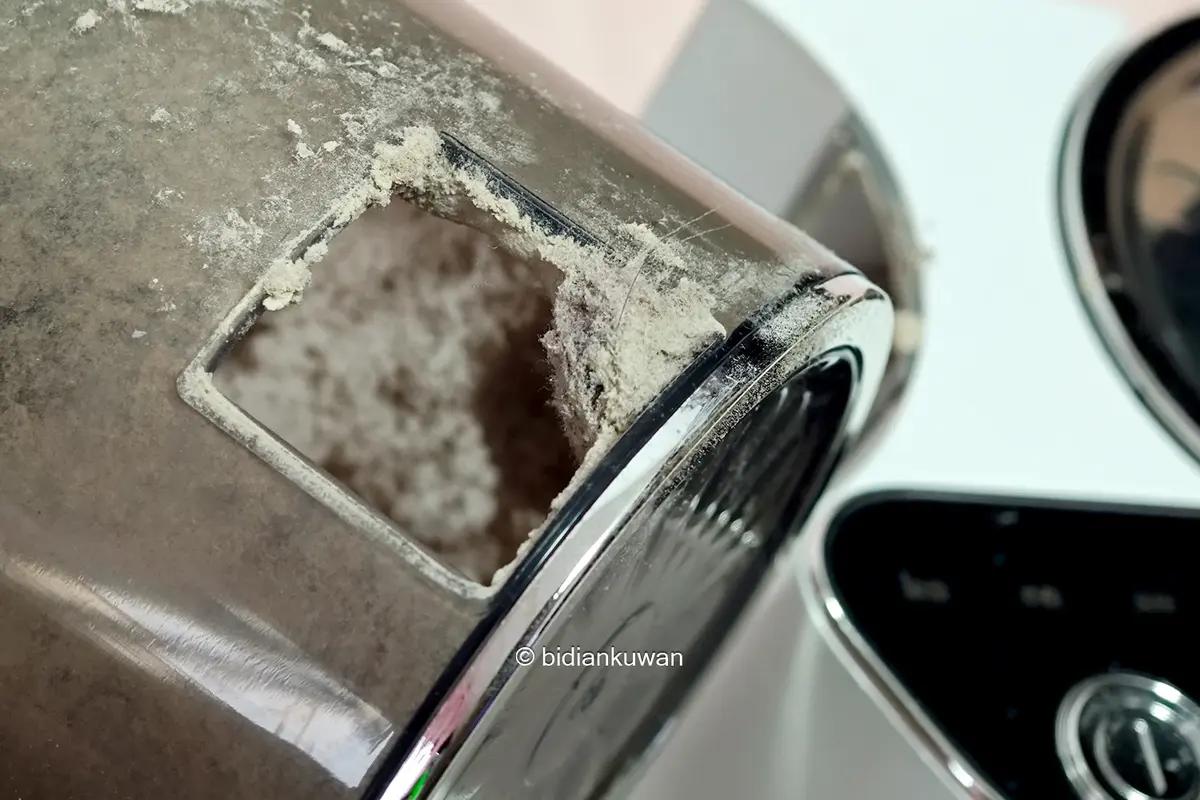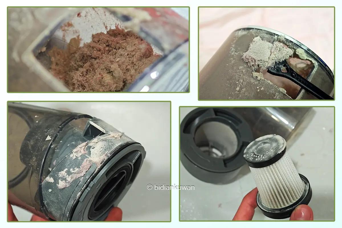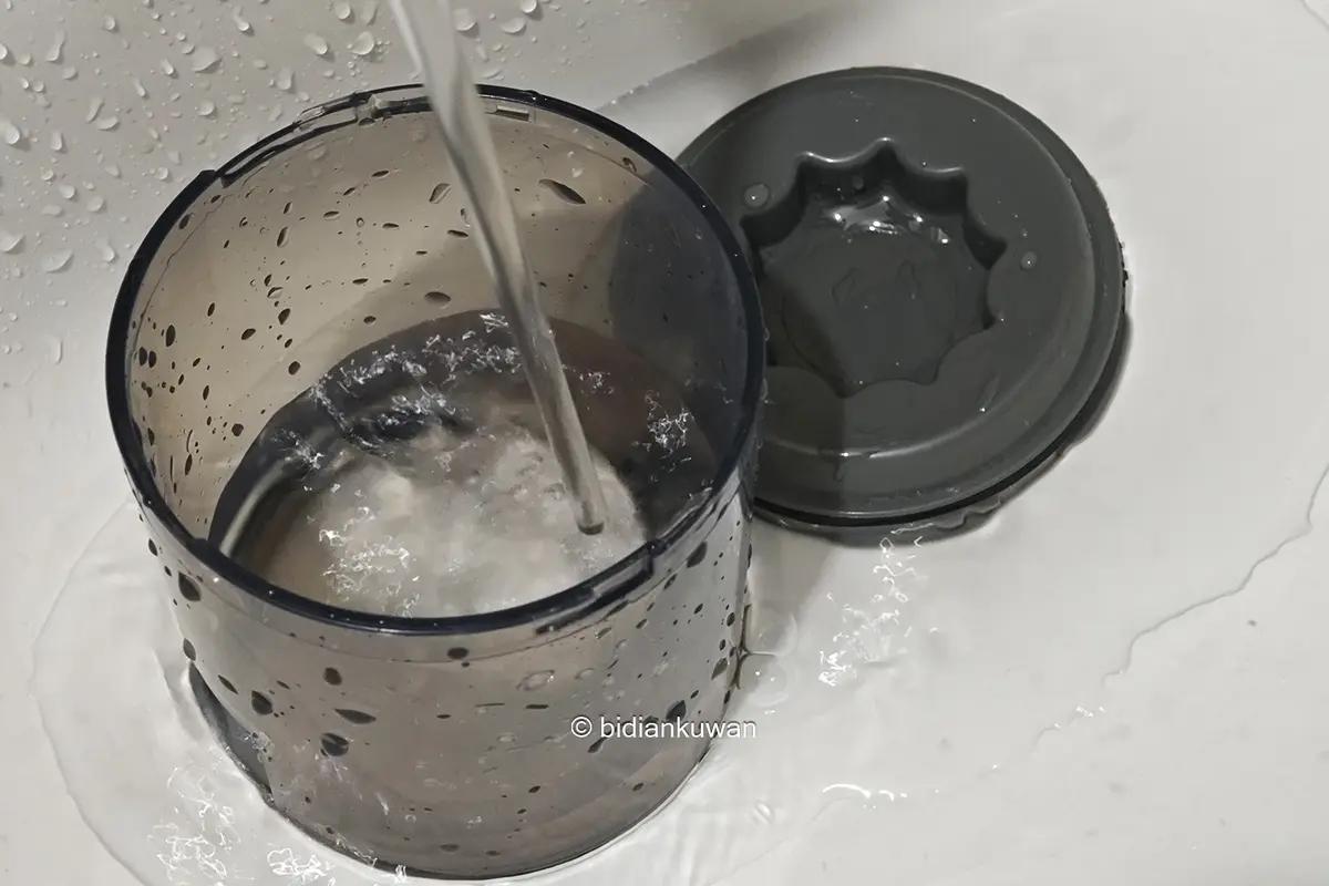 离尘杯这么近我都不敢喘大气,赶紧把俩尘盒拿到卫生间拆解,避免气流吹散二次污染,先接点水把大部分脏污倒掉,剩下的冲洗一下就搞干净了。