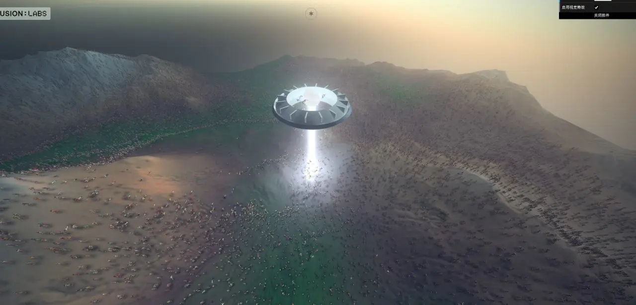 這是一個能操控飛碟的模擬器,飛碟下方的光束能將地面的人吸走,還可以聽到下方人羣的尖叫