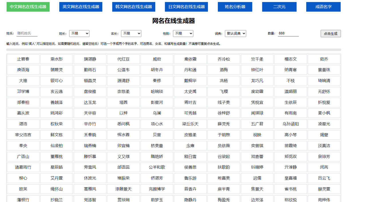 這個網站可以在線生成中文、韓文、日文、英文等姓名,這些姓名不一定用得上,因爲有些還挺沙雕的,但至少會給你起名字帶來靈感
