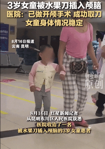 8月16日,云南昆明,东川区人民医院收治了一名被水果刀插入颅脑的3岁女童患者。医院工作人员表示,女童已接受开颅手术,水果刀已被取出,女童身体情况稳定。