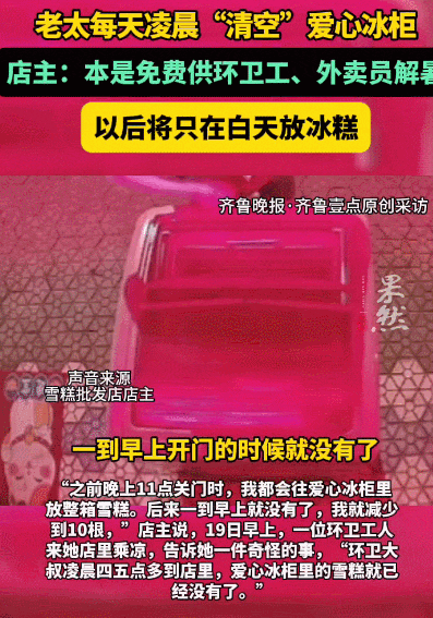 店主说,老太太像是定了闹钟准时出现,有多少她就拿多少,拿了就走。店主表示,公益她还会继续做下去,“但爱心冰柜之后只在白天放冰糕”。