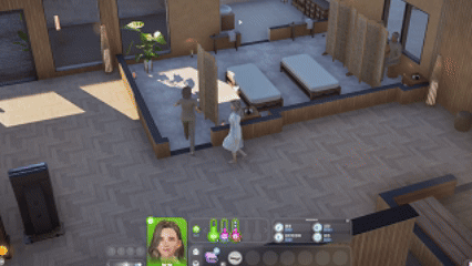 也可以操控某一位小人探索世界。地圖上有大量的可交互點,觀看電視、閱讀書籍、洗漱沐浴、健身鍛鍊、購物消費、泡網吧打電玩。每一個交互都有一套對應的動作模組。這些日常構成了這個探索驅動的世界