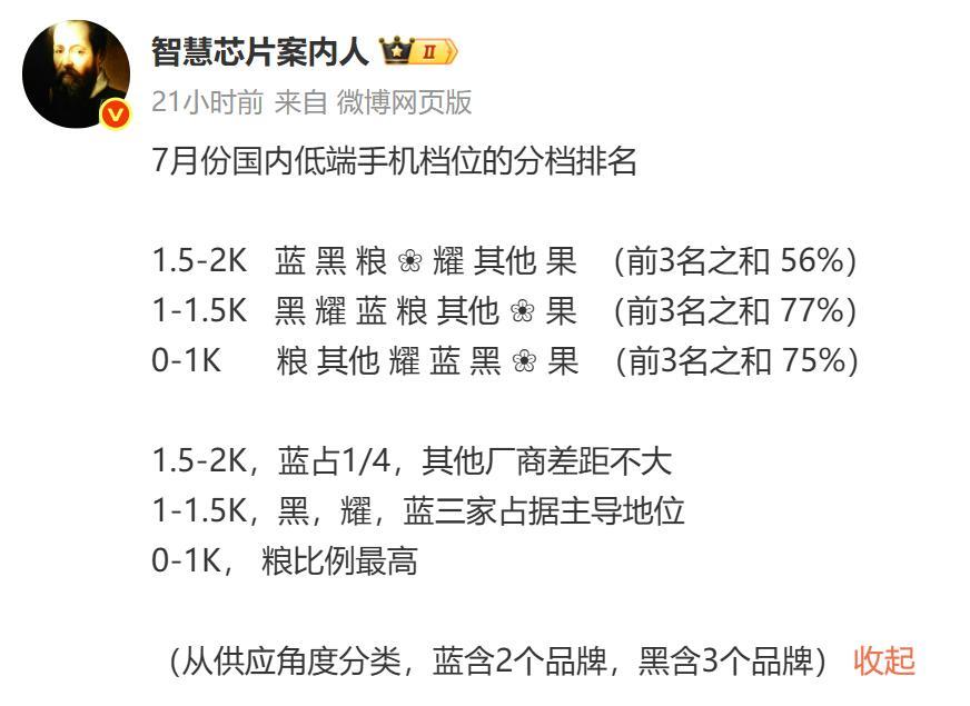7月份國內手機市場各價位段的排名,我們可以參考博主“智慧芯片案內人”提供的數據。高端手機這款,依然是蘋果和華爲斷層式領先其他4大安卓品牌;中端手機除蘋果外,其他5個品牌表現都不錯,OPPO和vivo稍微領先;低端手機除蘋果和華爲之外,安卓4的品牌都不錯,但千元以內市場,小米最強。