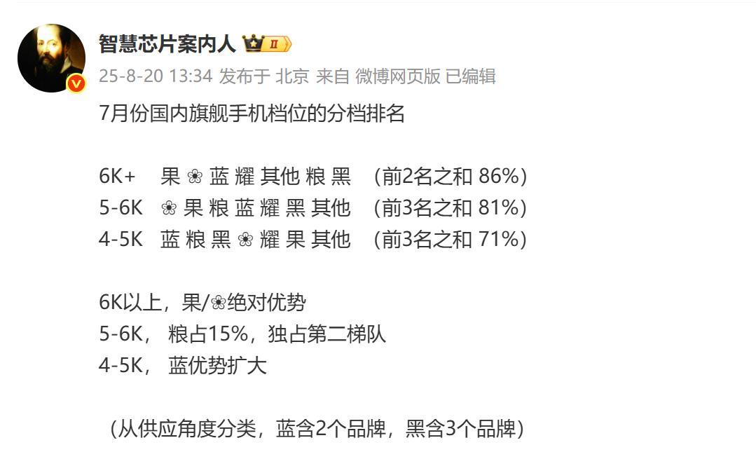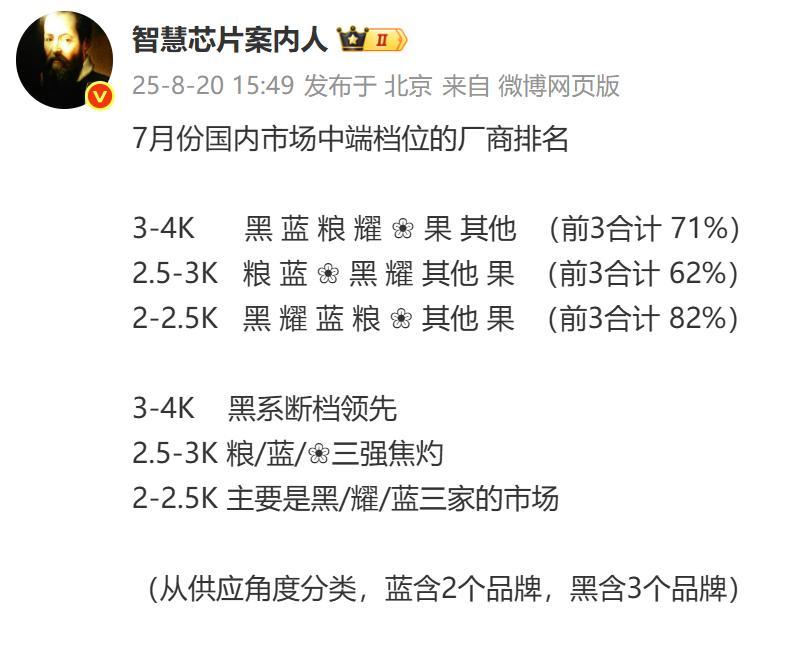2025年7月是銷售淡月,大盤下降了13%。從各個品牌各價位段的排名來看,蘋果和華爲依然牢牢佔據着國內高端手機市場,4大安卓品牌依然以中低端手機爲主,高端方面有一定的突破,但主要集中在4K-5K價位段,高端手機依然任重道遠。