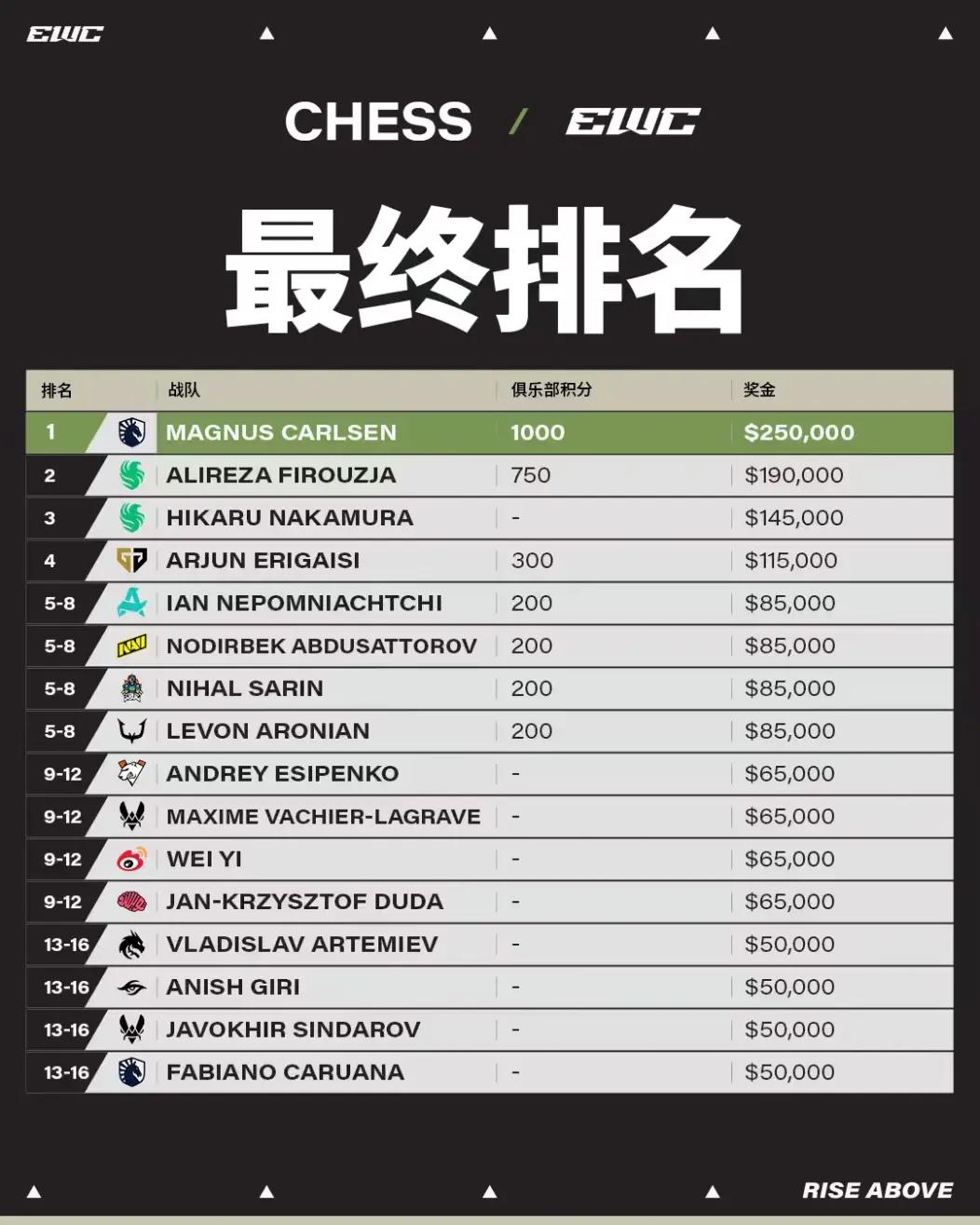 決賽Magnus Carlsen 5-1 Alireza Firouzj 奪得2025年電競世界盃《國際象棋》項目冠軍