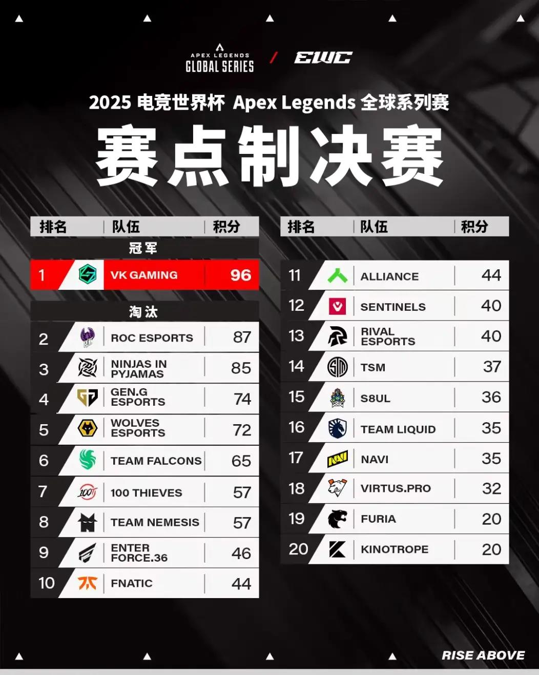 決賽第九局,手握賽點的VKG喫雞奪得了2025年電競世界盃《APEX英雄》的冠軍
