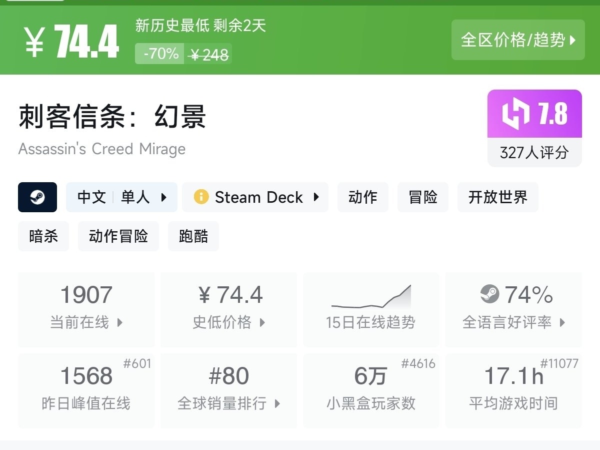 小型開放世界,得益於流程相比神話三部曲較短,罐頭味沒那麼重了。更加註重刺殺體驗是本作最大的賣點,不得不說經過一系列設計規劃出完美刺殺行動帶來的那種成就感是一路看看看比不了的。