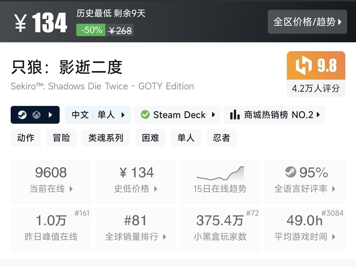 19年的年度遊戲,宮崎英高代表作之一,美術音樂玩法無一可以挑剔,且優化好不喫配置(大小更是隻有10幾個g),論起出圈程度,也許國內整個單機圈都還要感謝當年它的爆火。