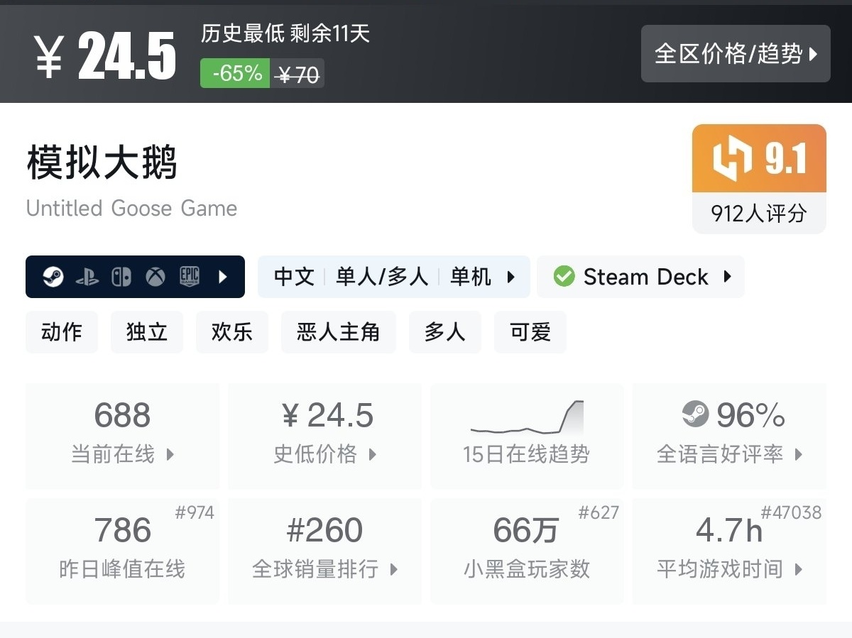是一款偷襲式鬧劇風格的開放式遊戲,你在遊戲裏是一隻鵝,讓原本清靜的村莊心神不寧。在小鎮上四處遊蕩,從後院到街頭店鋪,再到村裏的綠地,搞惡作劇、偷帽子、嘎嘎叫,毀掉所有人一天的生活。非常推薦兩個人一起玩,降低難度的同時樂趣加倍。