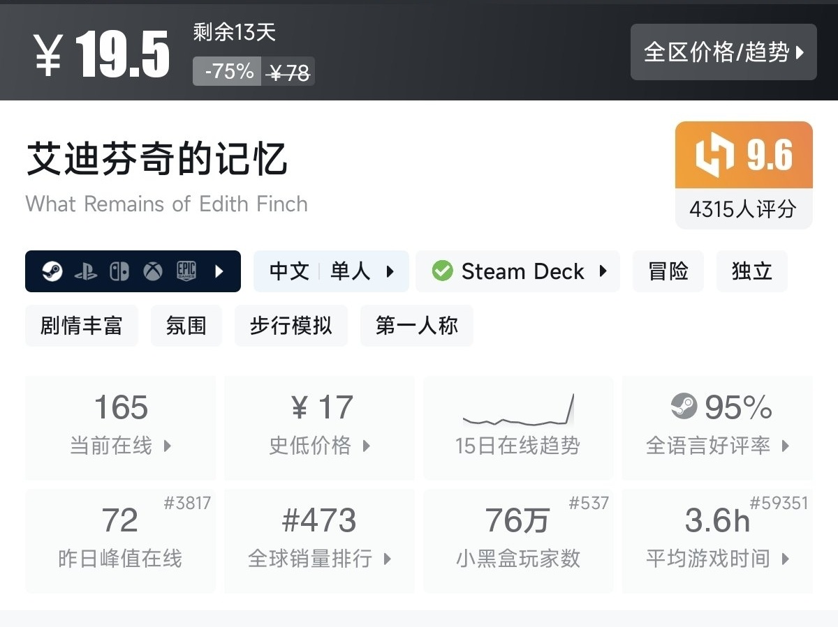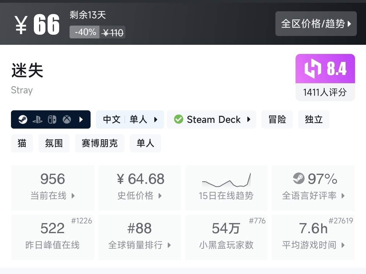 遊戲剛開始是最驚豔的,沉浸感很強,到後面發現第一個活體機器人開始,貓的視角就弱化了,感覺貓只是一個工具人。另外遊戲整體,還是略短,支線其實可以算沒有(收集歌譜),結尾打開頂部照亮世界其實是高潮,但處理的太倉促,導致最後失去回味。