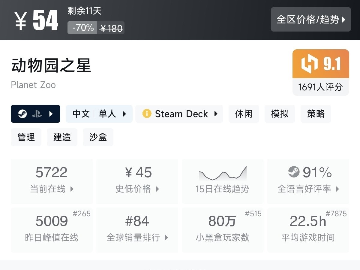動物園模擬器,比較適合喜歡動物並且願意爲動物創造更好的生存條件和展示條件的玩家,作爲一個模擬經營遊戲它的入手的難度算是比較低的,在對遊戲有一定了解後上限又十分高,無論是打造獨一無二的景觀,還是培養出完美的動物,都能讓作爲動物園園長的我們得到巨大的成就感。