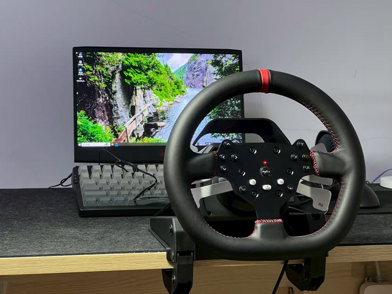 一是安装简单——拆开箱子只有方向盘、基座、踏板和桌面夹具,不用看复杂的说明书,十几分钟就能装完。桌面夹具固定得很稳,我玩地平线5时再怎么激烈驾驶,基座也不会晃。