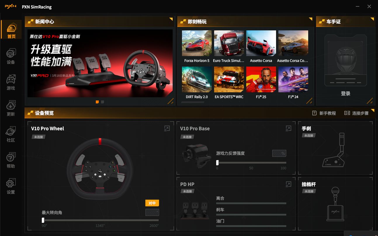 PC端应用——PXN SimRacing,功能非常丰富,包括测试设备功能是否完好、在线更新设备固件、实时调节设备各项数据参数、一键启动游戏以及实时查看基座温度防止过热,类似于鼠标键盘的驱动,非常方便。