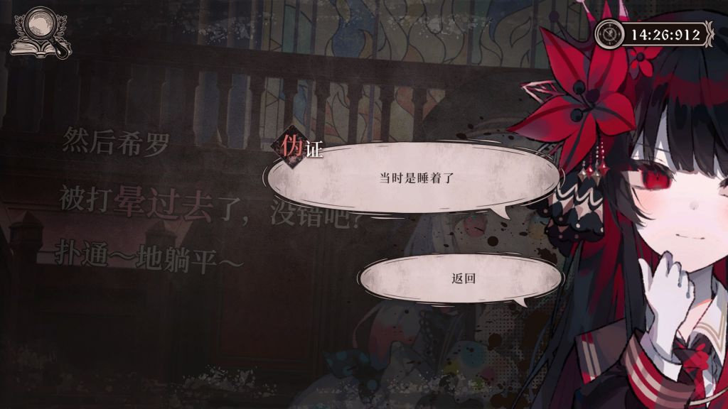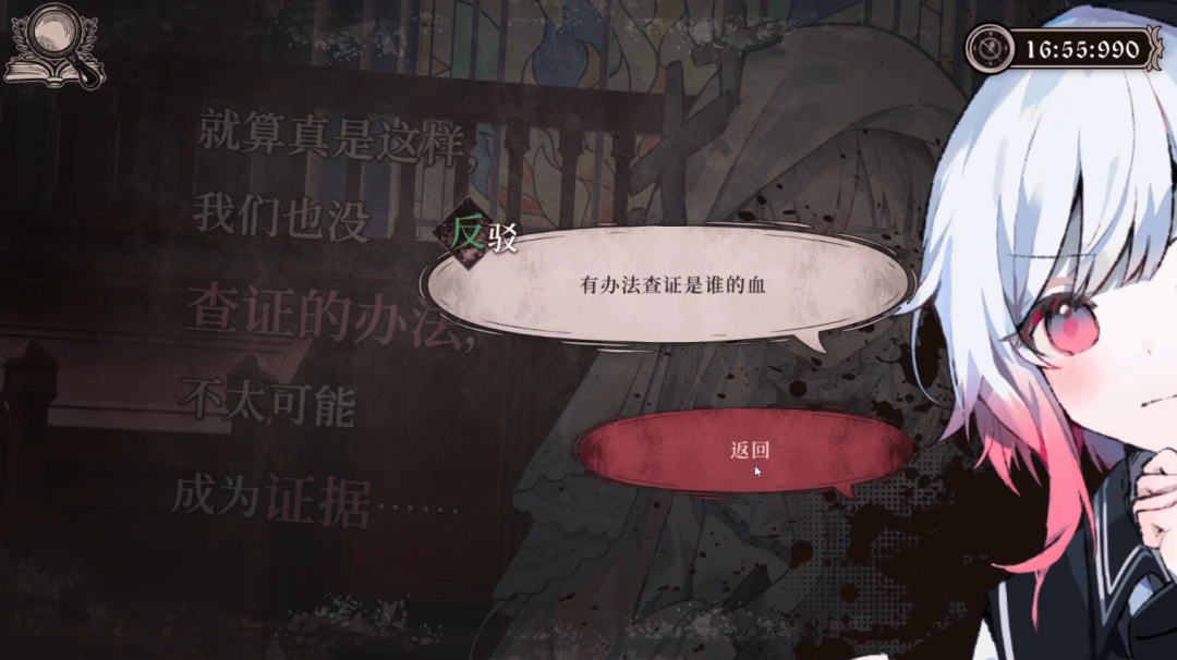 一個很重要的原因就是它在二週目修改了玩法,不再延續最開始對《彈丸論破》的模仿,而是直接取消了推理中的“蒐證環節”,同時藉助設定,將審判環節的目的從“尋找兇手”變成了“自證清白”。
